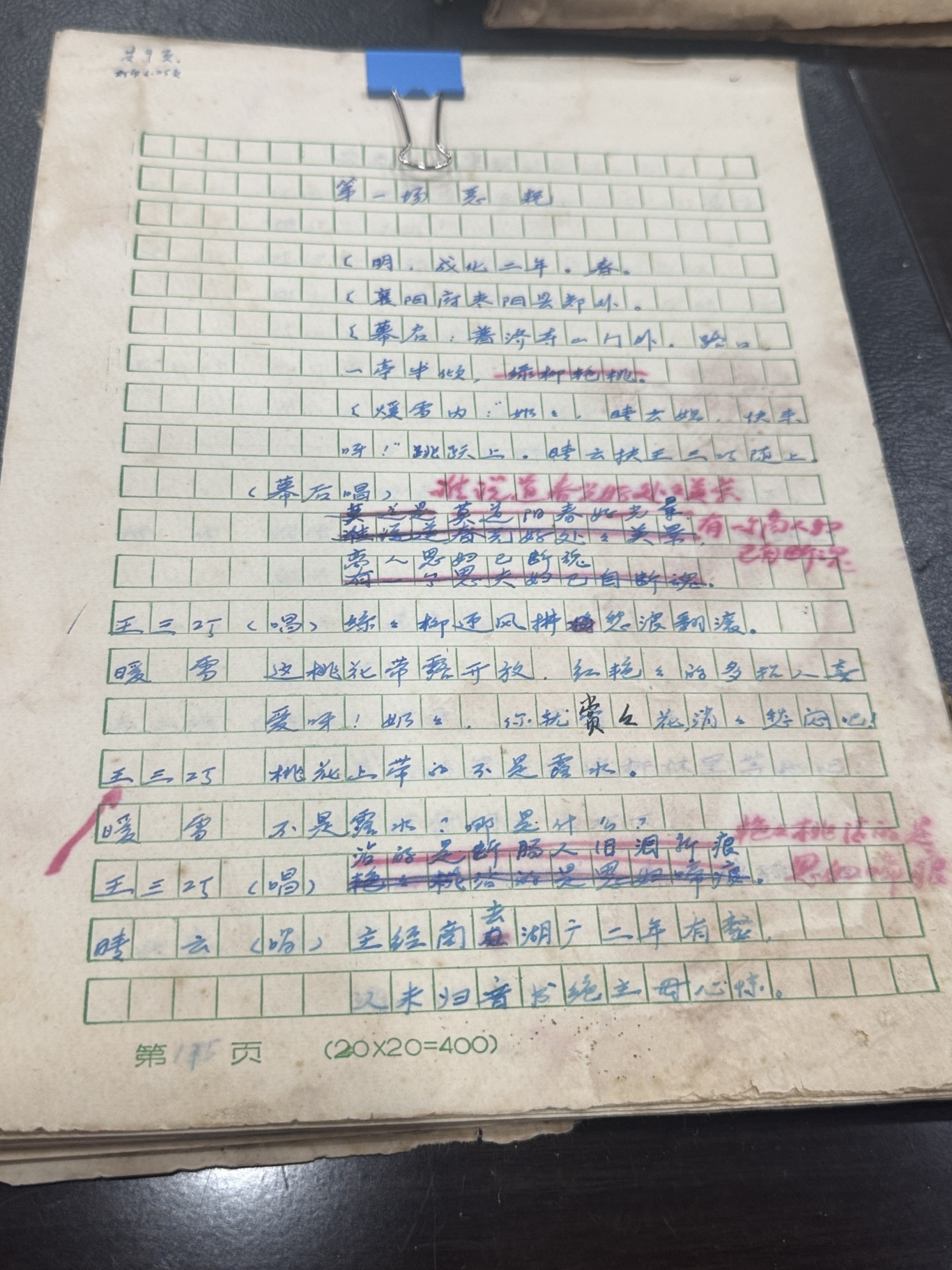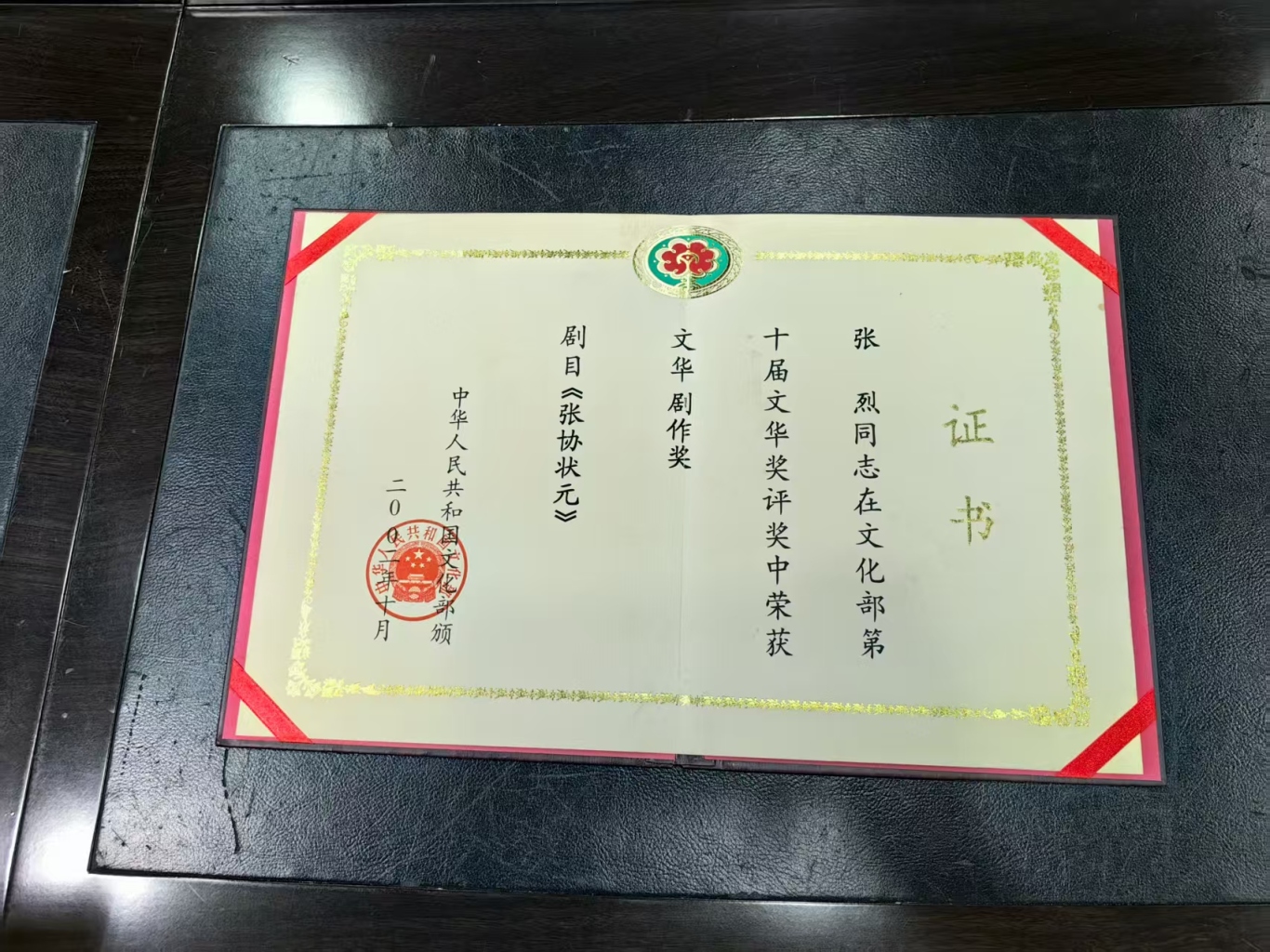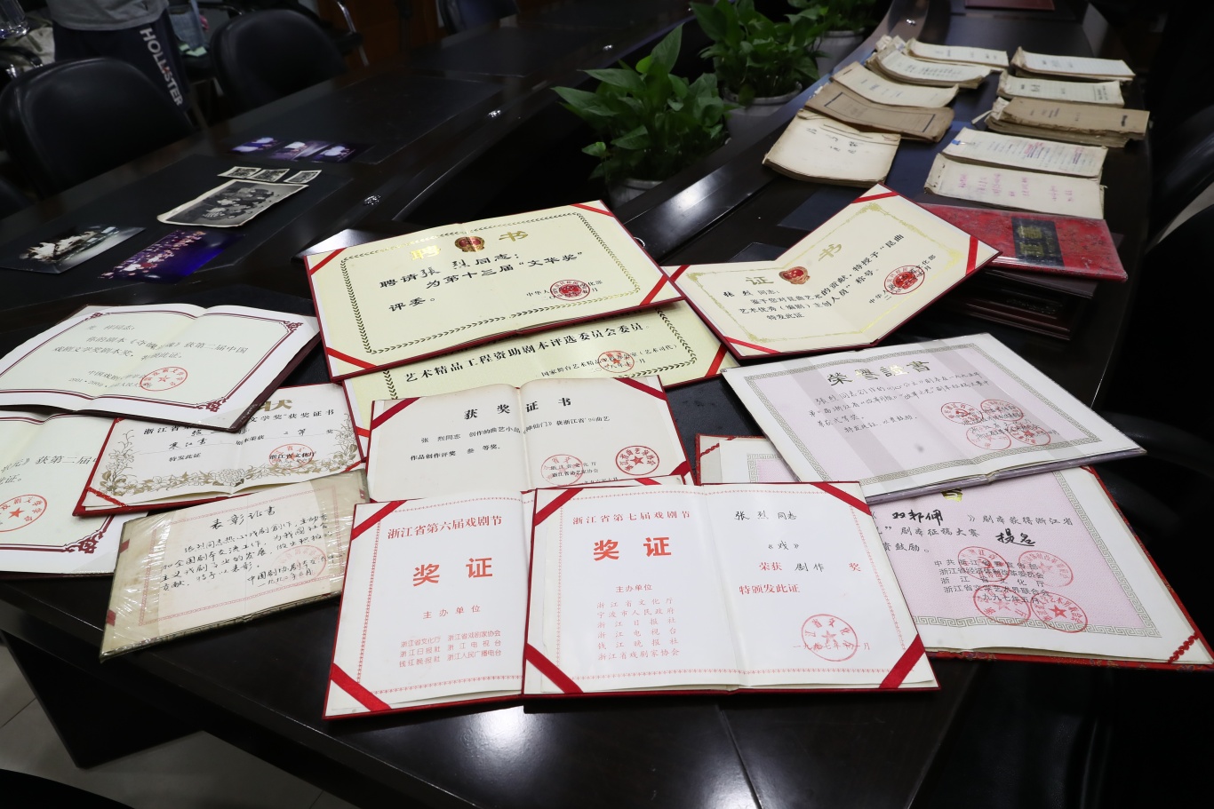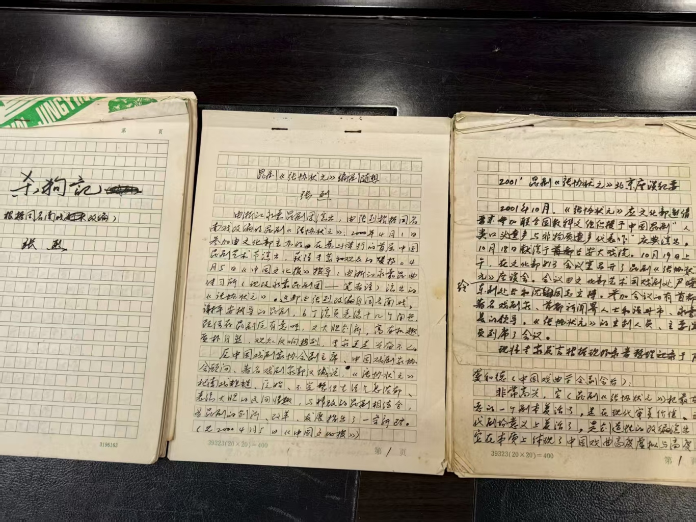 此次捐赠的193件资料完整呈现了张烈与戏剧相伴的一生。剧本手稿中,《张协状元》《杀狗记》《高机和吴三春》等剧目的初稿、修改稿多写在泛黄的格子纸上,部分带有破损,更显珍贵。单《张协状元》就有四本相关资料:一本初稿、一本印刷稿、一本2001年北京座谈纪要,还有一本编剧随想。初稿上满是修改痕迹,各式批注交错,有的句子被圈画后重写,清晰展现了《张协状元》从雏形到成熟的打磨过程。奖项证书里,“中国曹禺剧本奖”“文华奖”“法国戏剧塞纳大奖”等荣誉见证作品的影响力;剧照与合影则定格了舞台内外的瞬间,让文字之外的创作故事更显鲜活。