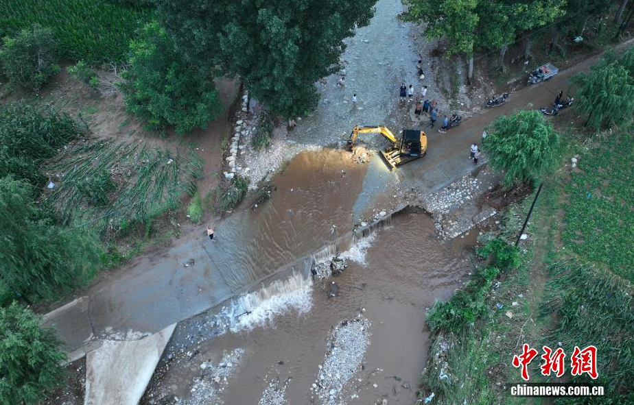 7月25日,航拍河北省保定市易县北淇村道路抢修现场。河北省保定市易县防汛抗旱指挥部办公室25日最新消息,受24日至25日强降雨影响,该县共造成182个村受灾,转移686户1697人,无人员伤亡。目前,抢险救援正在有序进行。(无人机照片)中新社记者 韩冰 摄
