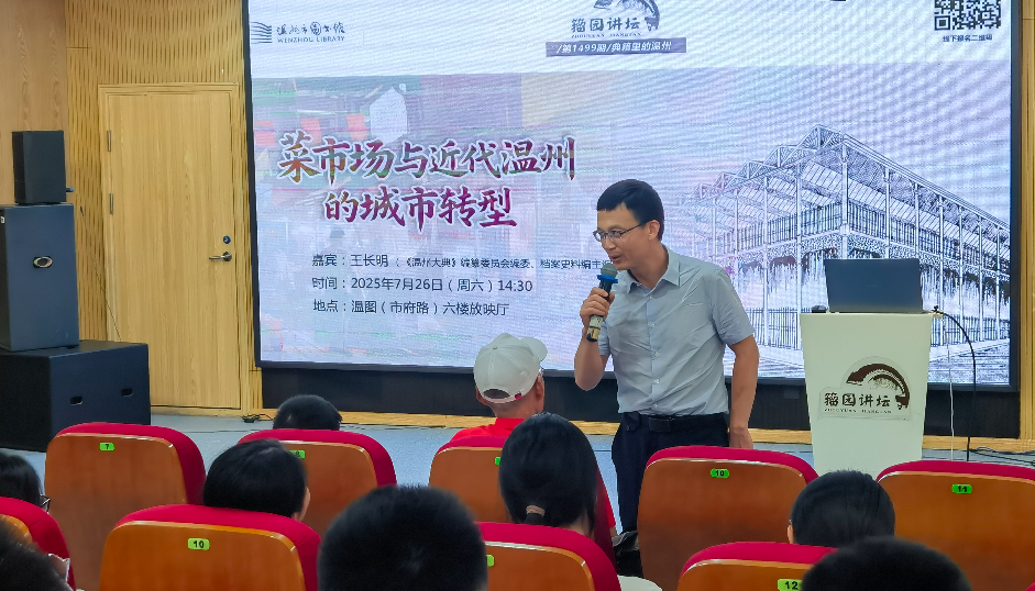 7月26日下午,温图籀园讲坛携一缕市井烟火气,在温图(市府路)六楼放映厅开启了一场穿越百年的城市寻根之旅。本期主题聚焦于看似寻常却意义非凡的城市空间——“菜市场与近代温州的城市转型”。《温州大典》编纂委员会编委、档案史料编主编王长明老师,以深厚的史料功底与独到的城市史视野,为现场听众揭开近代温州城市肌理演变中一段鲜为人知的“烟火传奇”。