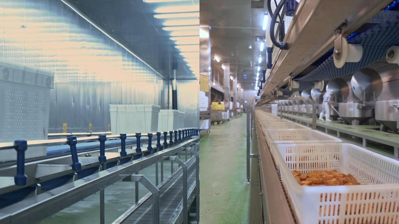 走进九多肉多位于河南原阳的智能化工厂,场景令人震撼。无菌净化车间内,墙壁全是不锈钢,甚至很多地面也是不锈钢。一条条全自动生产线高速运转,经标准化卤制的猪头肉、猪蹄、鸡爪在传送带上列队前行。空气中卤香浓郁,却不见丝毫油污烟火气。