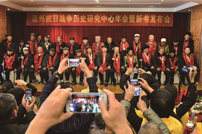 2017年12月17日,温州抗战历史研究中心举办年会,邀请30余位抗战老兵提前迎新年,共庆《走访抗战老兵手记》(增订版)发布。 杨冰杰 摄