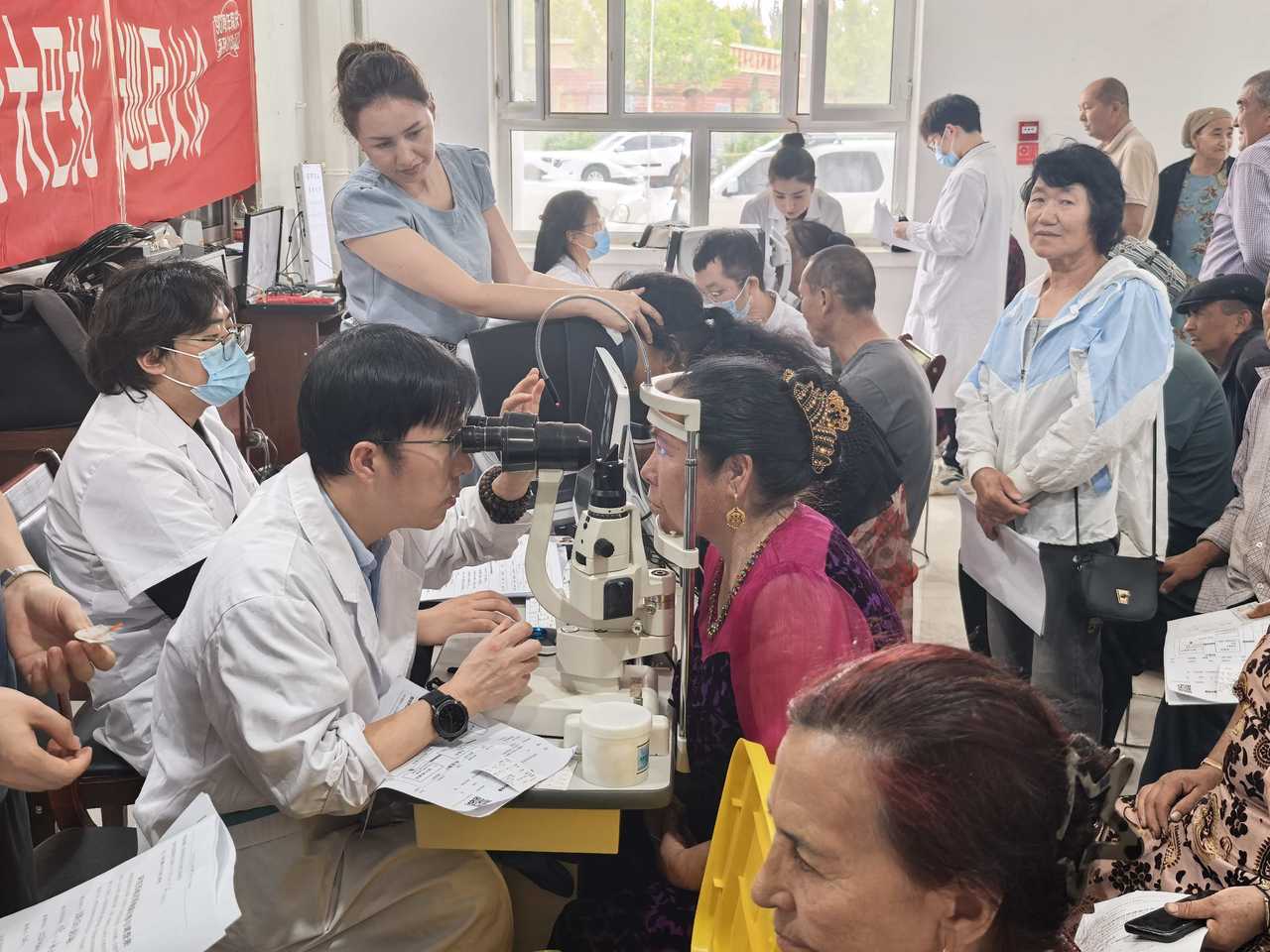 温医大附属眼视光医院陈蔚教授为新疆当地群众开展眼病筛查。活动方供图