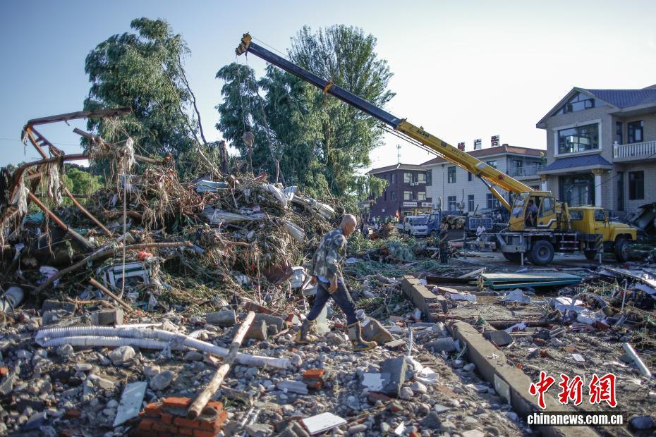 7月29日,天津市蓟州区下营镇下营村青年桥畔,工作人员清理被洪水冲倒的树木及杂物。