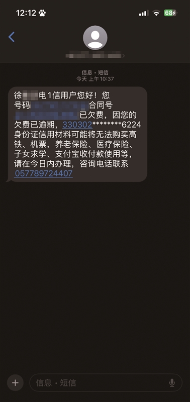 温州网讯 近日,市民徐女士在微博上晒出的一条电信宽带“欠费催缴”短信引起不少网友的关注。短信显示,因欠费已逾期,徐女士身份证信用材料可能将无法购买高铁、机票、养老保险、医疗保险,影响子女求学、支付宝收付款使用等。