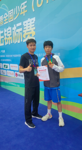 今年5月,雷京武和弟子章哲凯在全国少年(U16)男子拳击锦标赛的夺冠赛后合影。