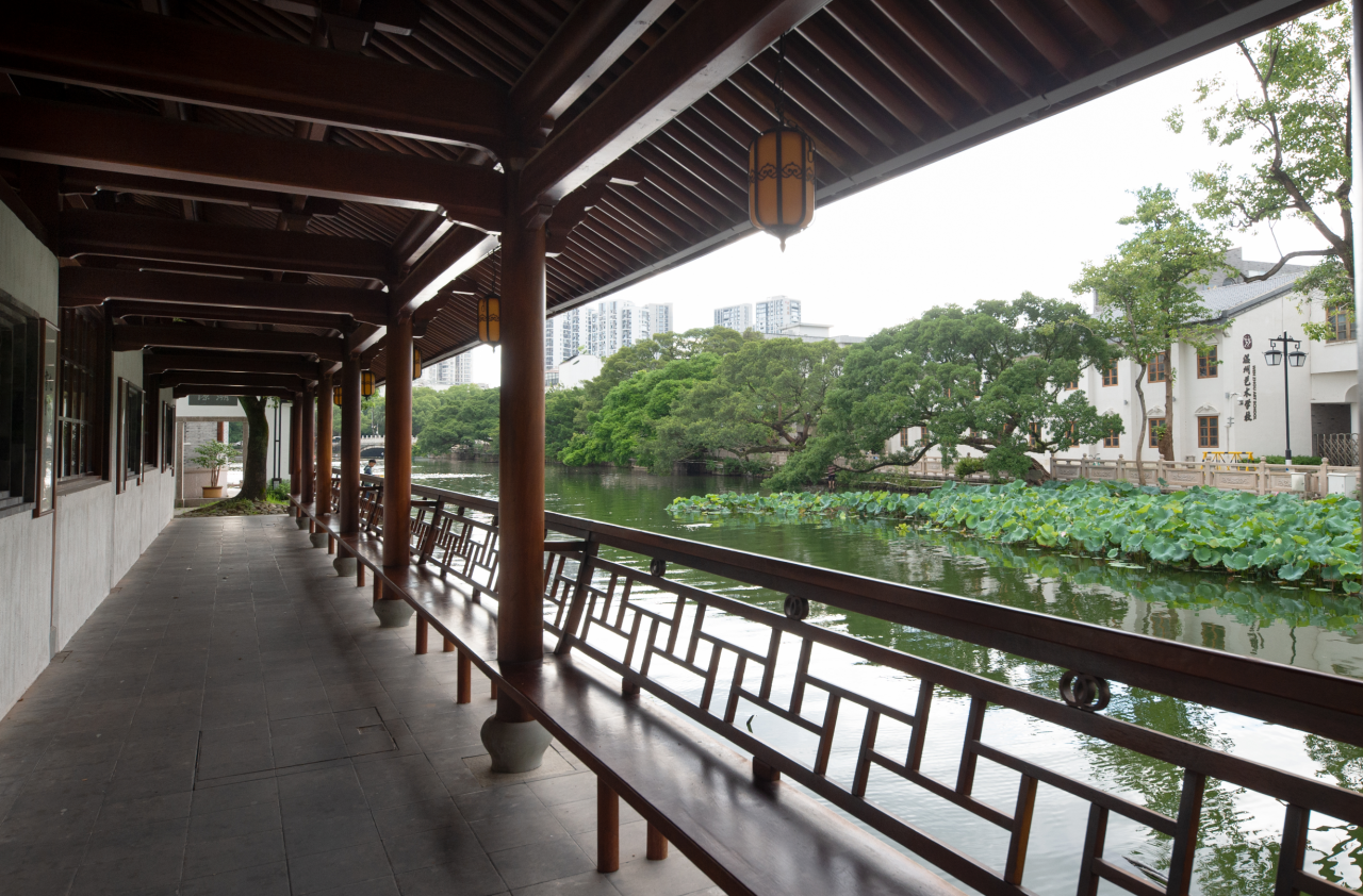 松台别业共有两处入口,其一是从胜昔桥方向步入。穿过胜昔桥,顺着木质的河边走廊往前走,风掠过廊檐,裹挟着九山湖的湿润气息漫过来,沁人心脾。