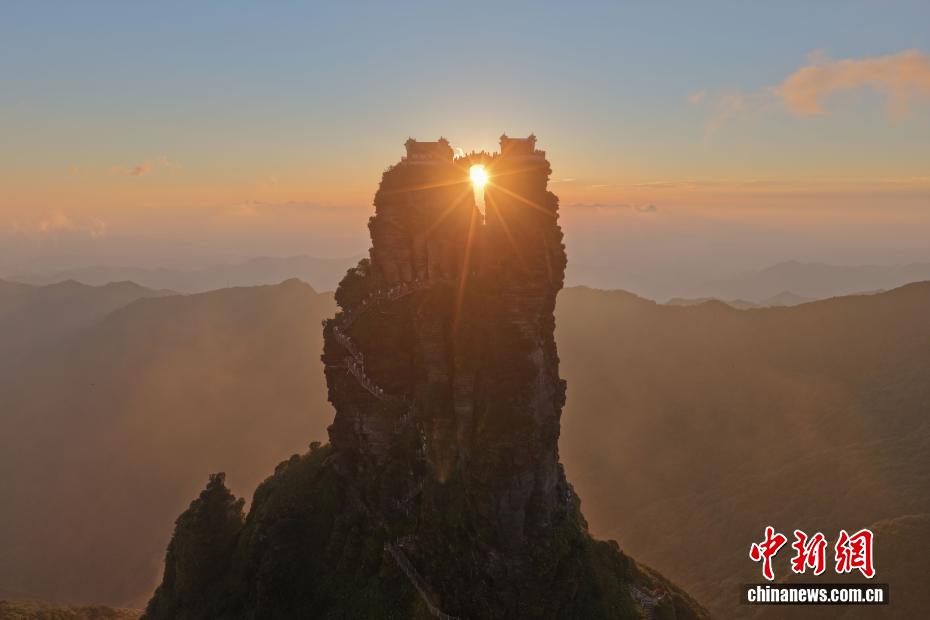 7月31日,贵州省铜仁市世界自然遗产地梵净山云雾似纱,美景如光影画卷。图为航拍世界自然遗产地梵净山红云金顶日落观景。(无人机照片)