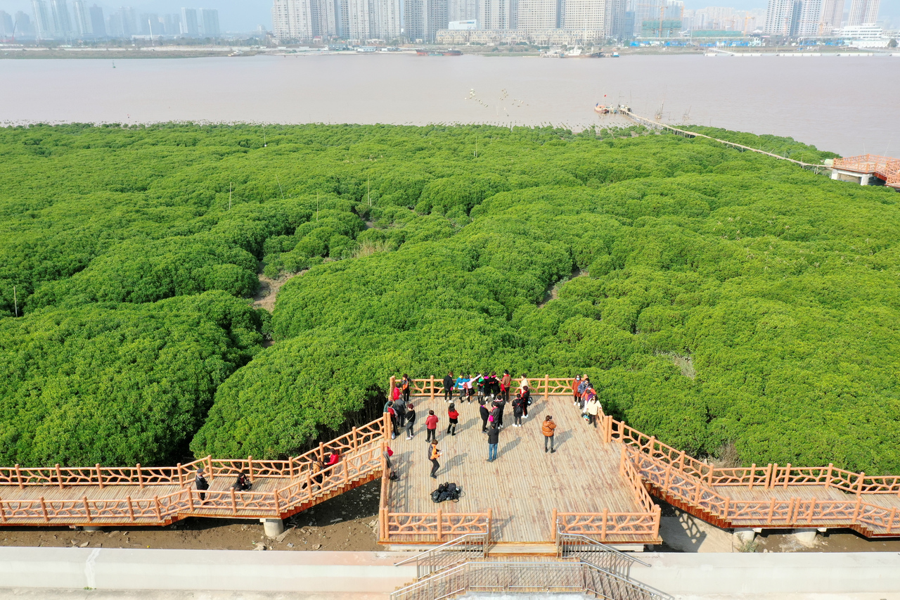 漫步龙港市新美洲社区的江滨栈道,沿途茂盛的红树林高低有致、层次分明,犹如一层层陆地上的碧浪。轻风拂过,红树林随风摇曳,似一幅美丽画卷凌空展开。