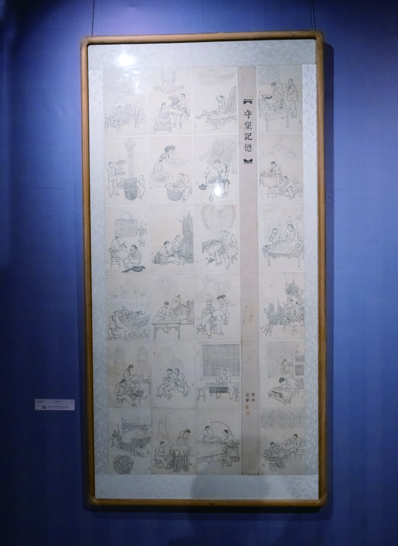 在本次的展览中,项之华共展出了两幅作品,一是工笔白描图《守望记忆》,由项之华此前描绘的105幅温州百工插画图集成而来,选取了其中最具代表性的24幅插图重新绘制。二是玻璃银光刻作品《赛龙舟》,描绘了亚运期间温州龙舟运动中心进行龙舟比赛的场景。