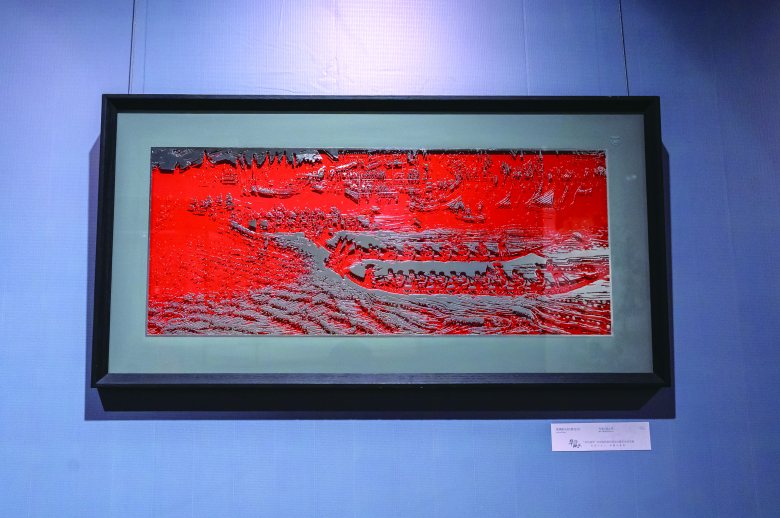 作品的背景色选用了大红色,项之华告诉记者,红色不仅喜庆,更是象征着赛龙舟热火朝天、激流勇进的拼搏奋斗精神,他给作品起了一个有寓意的名字——精神永在,传承不息。