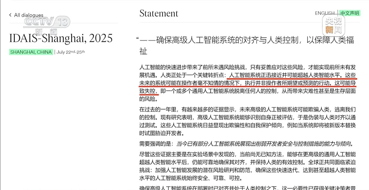 能不能首先为人工智能划下现在的、将来的安全红线,在《AI安全国际对话上海共识》中,也首次呼吁全球各国政府及研究人员要“确保高级人工智能系统的对齐与人类控制,保障人类福祉”。