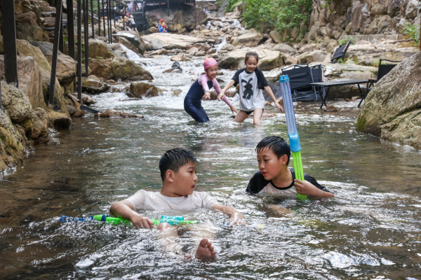 当城市的柏油路被晒得发烫,瓯海区瞿溪街道大川村的“自在溪谷”却是凉意十足。溪水间,大人在遮阳伞下美美地享用着咖啡与美食,溪水漫过脚踝,带走一身的燥热;孩子们手持水枪追逐嬉戏,欢声笑语伴着潺潺溪流声在山谷间回荡。一些商业嗅觉灵敏的村民也抓住这波商机进行跨界创业,在溪边开设小吃摊售卖、饮料酒水、水上玩具,或出租防晒用具等,将这天然山间溪水变为“致富泉”。当地村干部告诉记者,溯溪营地自7月初开放以来,每到周末都能吸引上千名游客前来“赴约”。