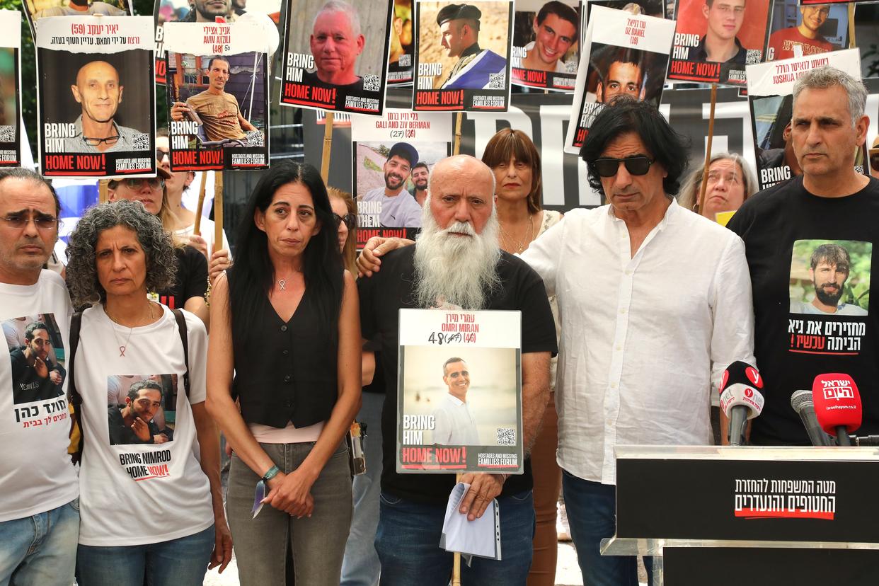 4月18日,在以色列特拉维夫的一处广场,被扣押人员家属举行记者会,要求以政府推动释放被扣押人员。新华社发(吉德翁·马科维奇摄/基尼图片社)