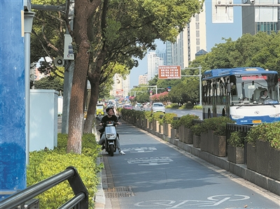 记者在府东路上看到,一位市民骑电动自行车到了路口等待绿灯通行,为了躲避烈日,不得不将车子歪斜地停在绿化带旁,借着几株铁树稀疏的阴影勉强遮阳。另一位骑车带着孩子的女子说:“孩子坐在后座直喊热,特别是车子停下来,要是路上有更多的遮阳棚就好了。”