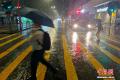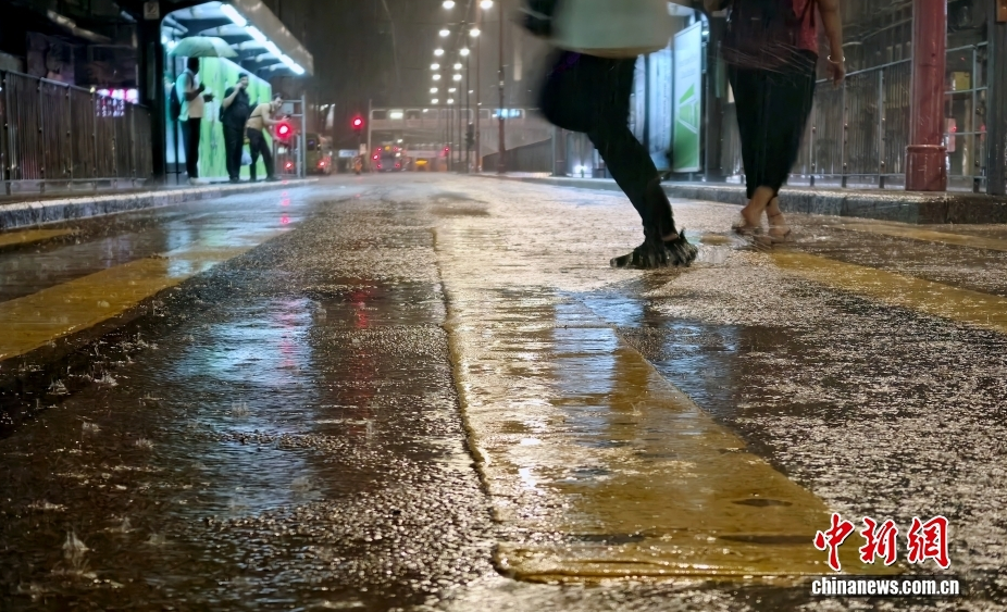 8月4日23时45分,香港天文台发出黑色暴雨警告信号(俗称“黑雨”),这是自7月29日以来第三次发出“黑雨”信号,也是香港自1992年暴雨警告系统设立以来,首次出现七天内三次发出“黑雨”信号。图为香港市民深夜在北角街头冒雨出行。中新社记者 侯宇 摄