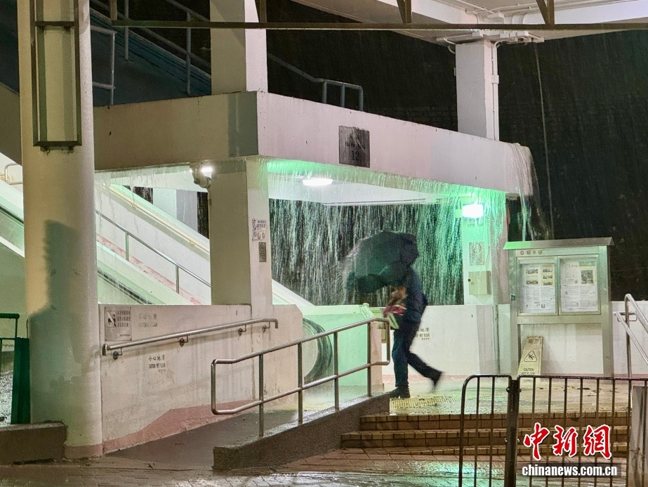 8月4日23时45分,香港天文台发出黑色暴雨警告信号(俗称“黑雨”),是一周内第三次发出“黑雨”信号。香港岛东区筲箕湾受“黑雨”影响,耀东邨一入口处出现“水帘洞”,居民冒雨撑伞穿过“水帘洞”返回住所。中新社记者 戴梦岚 摄