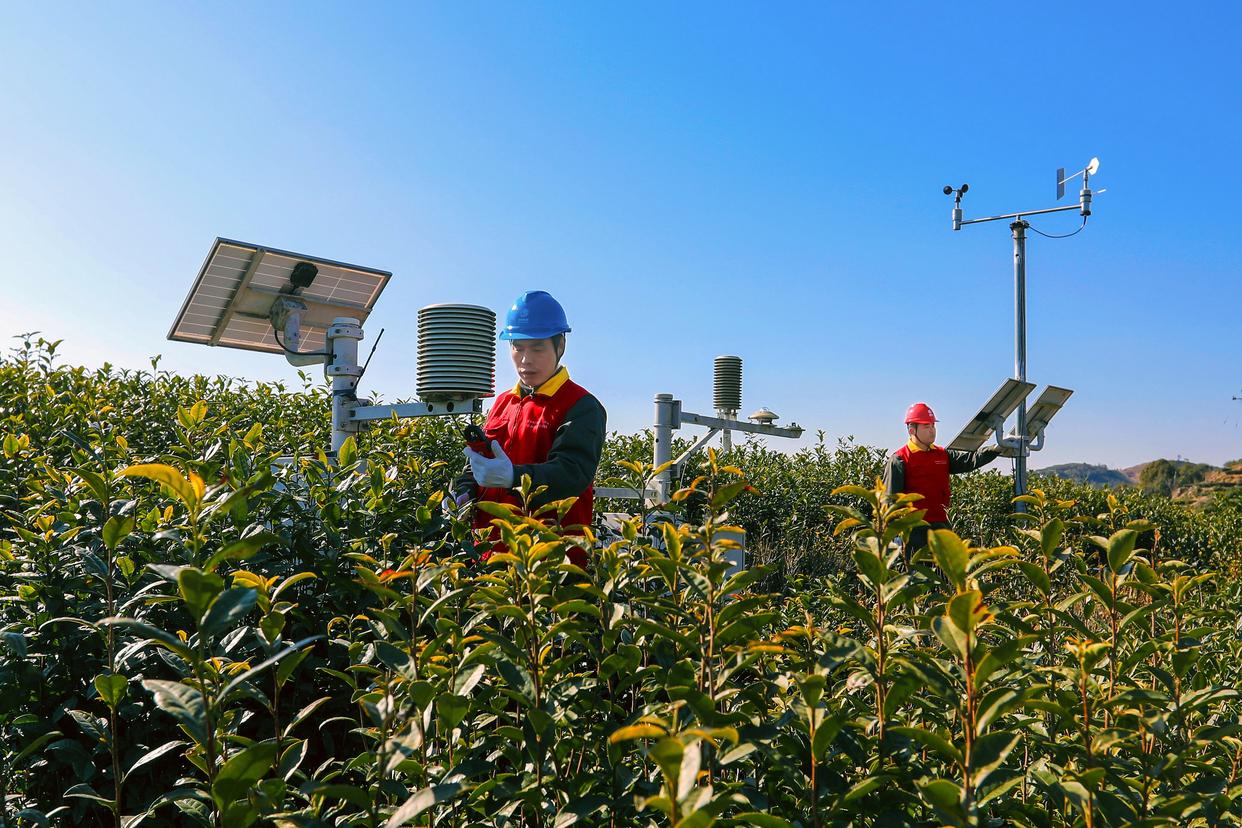 国网浙江温州供电公司员工在浙闽交界茶园检修太阳能杀虫灯(受访单位供图)