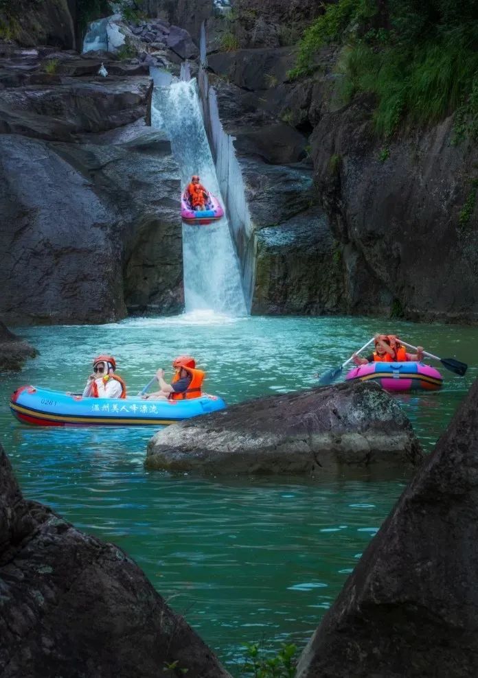 美人峰漂流坐落于楠溪江畔,依天然峡谷地貌精心打造,3公里长的河道串联起13道奇幻关卡。