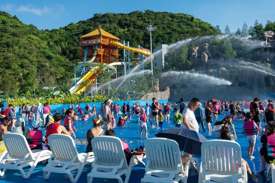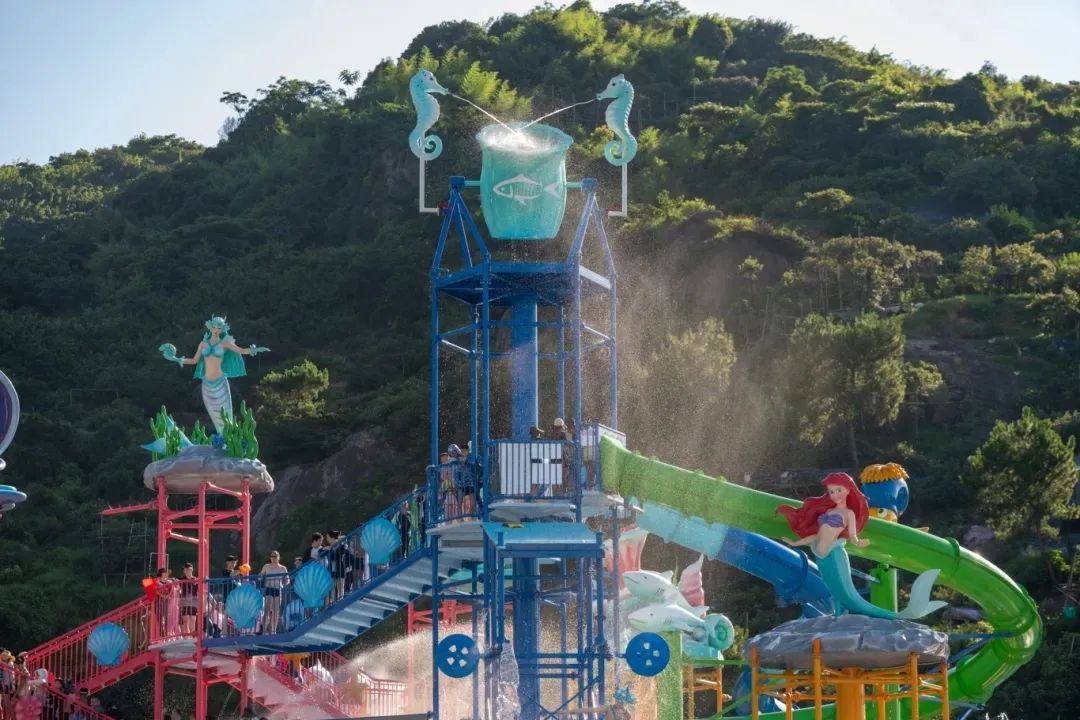5月31日开启试运营的奇妙美人鱼水世界,是一座占地5.4万㎡的海洋主题乐园。园区以海洋探险为主题脉络,巧妙融合大罗山自然山景与人工打造的两座山体,遍植棕榈、芭蕉等热带植物,构建沉浸式雨林景观。