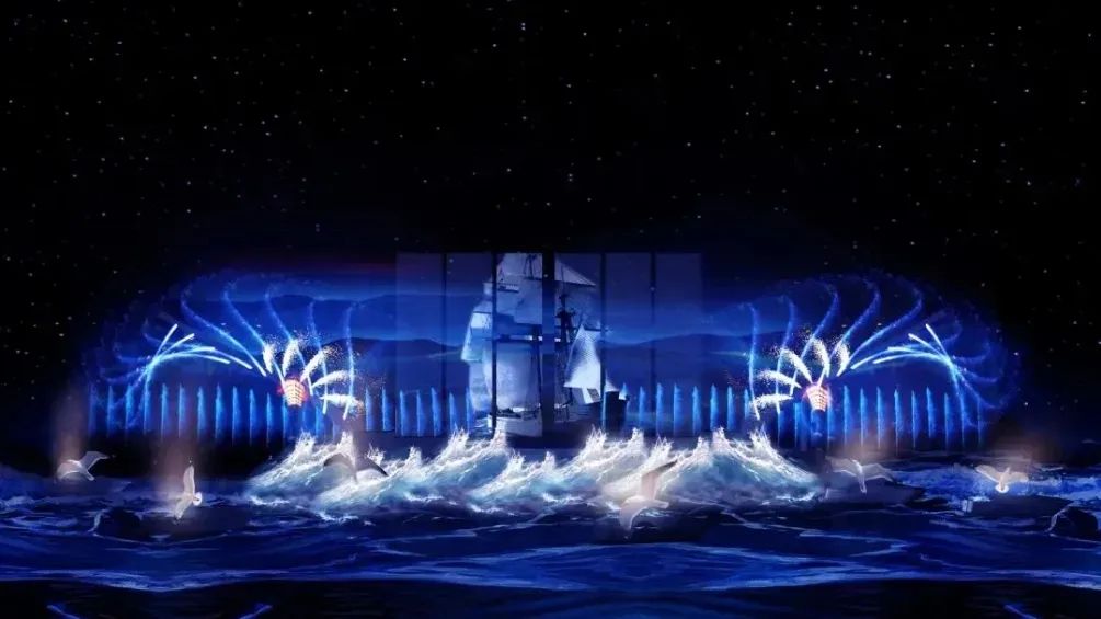 到了夜晚,夜幕降临,这里还将上演梦幻灯光秀,声、光、电相相辅相成,打造出一部精彩的水上视觉盛宴。