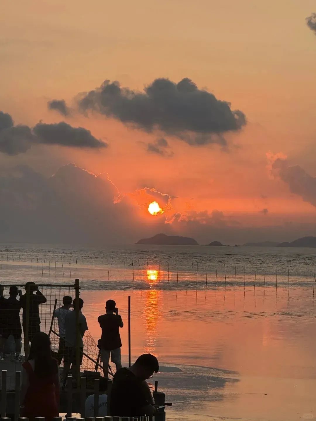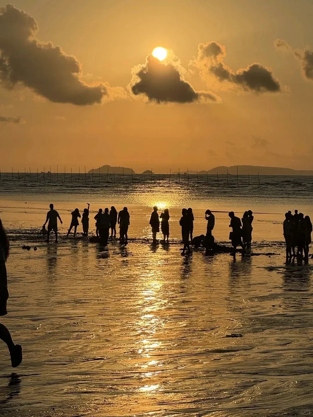 沙色如金,浪花翻涌,潮起时是温柔的海浪轻语,潮落后又铺开一片镜面般的海涂。夕阳西下时,整片沙滩被染成蜜糖色,仿佛时光也停下了脚步。