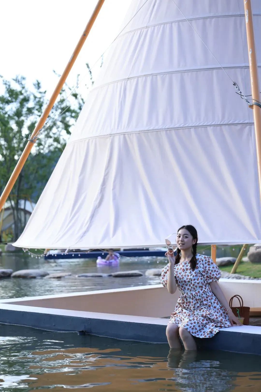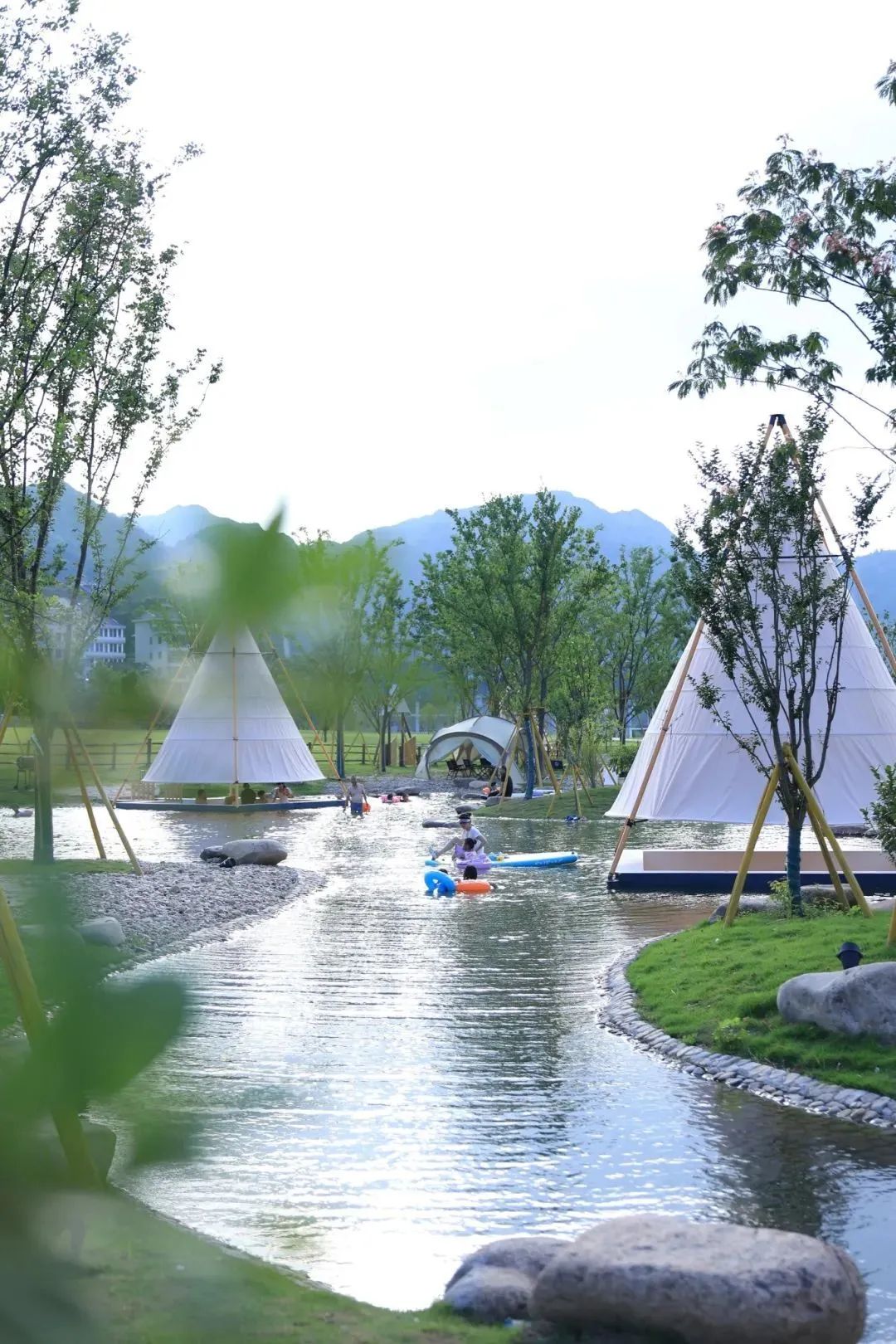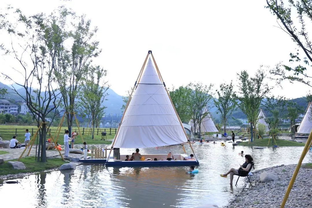 高擎的竹节灯笼帐下,是一个个下沉式的环水卡座,外侧就是围合式浅滩,适合大小朋友摸鱼捉虾、戏水欢闹,四下皆是闲适~