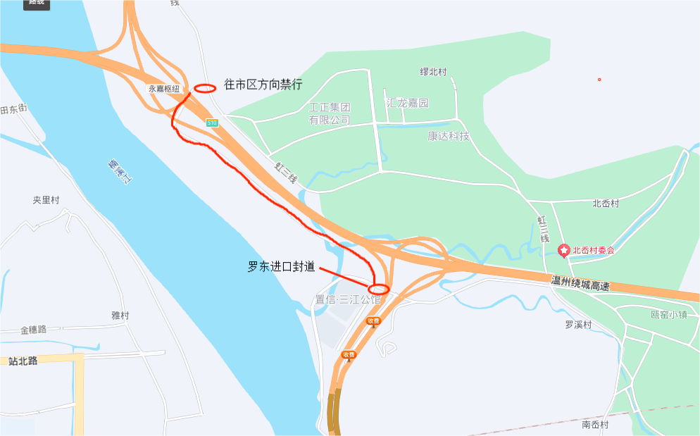 诸永高速延伸线温州方向启灶互通 C 匝道温州北动车站方向分流,诸永高速延伸线杭州方向三江出口主线分流,温州北站往诸永高速延伸线温州市区方向匝道关闭。罗东往温州市区方向进口关闭,封闭金水路至启灶互通连接线楠溪江大桥,杭州方向三江往诸永高速延伸线进口关闭。