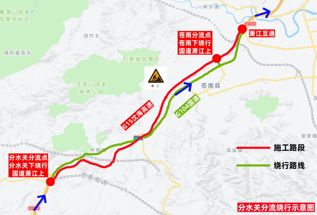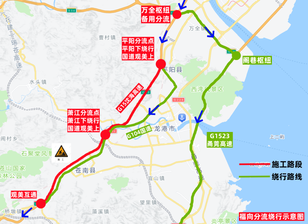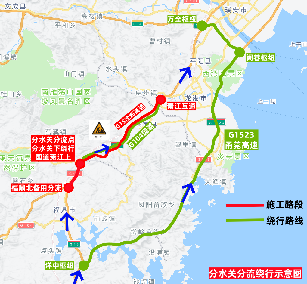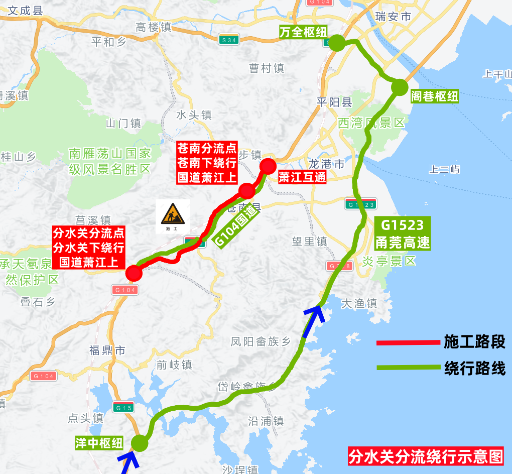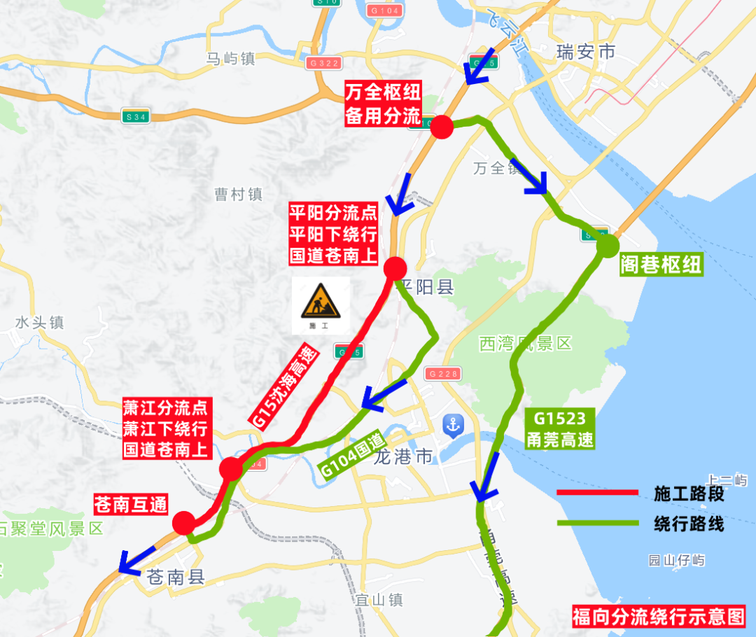 施工期间,福建方向车辆分流下高速后,可走G104国道从苍南互通上高速,或直接通过万全枢纽绕行S10绕西南高速转G1523甬莞高速南下。