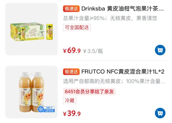 山姆会员商店的NFC黄皮混合果汁也很受欢迎,用云浮郁南产的无核黄皮加工制作,还有一款黄皮油柑气泡果汁茶。