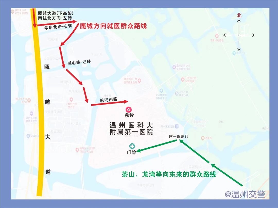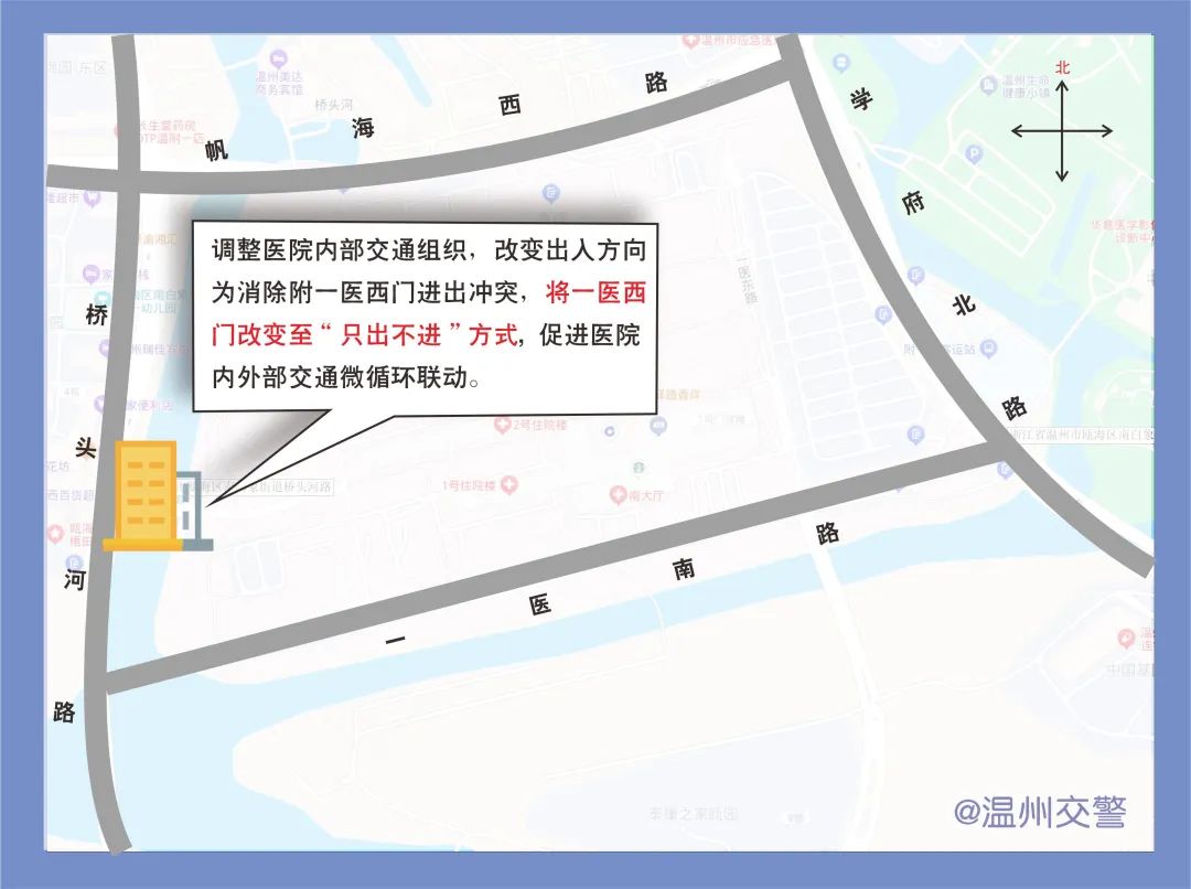 为消除温医大附一院西门进出冲突,将一医西门改变至“只出不进”方式,促进医院内外部交通微循环联动。