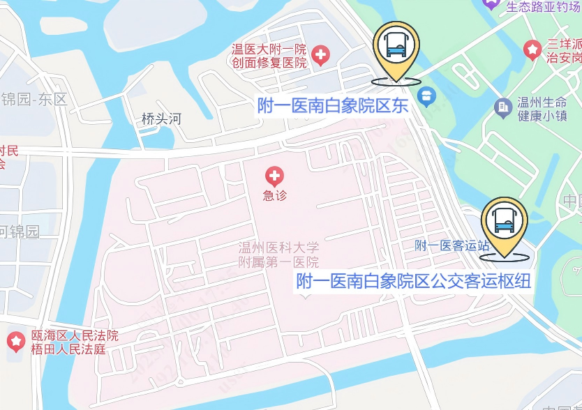 70路、131路、B104路、B8路、103路、87路可在“附一医南白象院区公交客运枢纽”或“附一医南白象院区东”站点下车;141路可在“附一医南白象院区公交客运枢纽”站点下车。