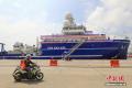 当地时间8月8日,中国厦门大学“嘉庚”号海洋科考船在印度尼西亚雅加达举行公众开放日活动。图为一男子骑车经过停靠的“嘉庚”号。中新社记者 李志全 摄
