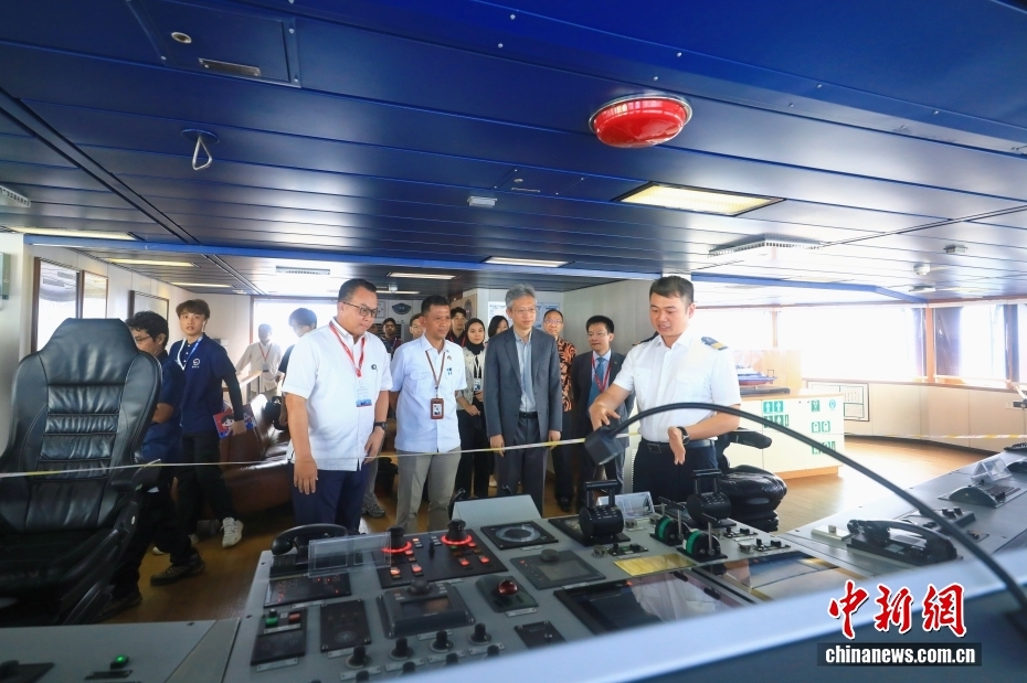 当地时间8月8日,中国厦门大学“嘉庚”号海洋科考船在印度尼西亚雅加达举行公众开放日活动。图为中国驻印尼大使王鲁彤(前排中间)等嘉宾在驾驶室内参观。