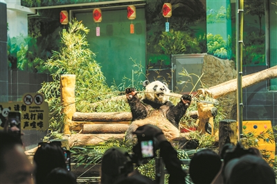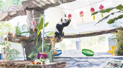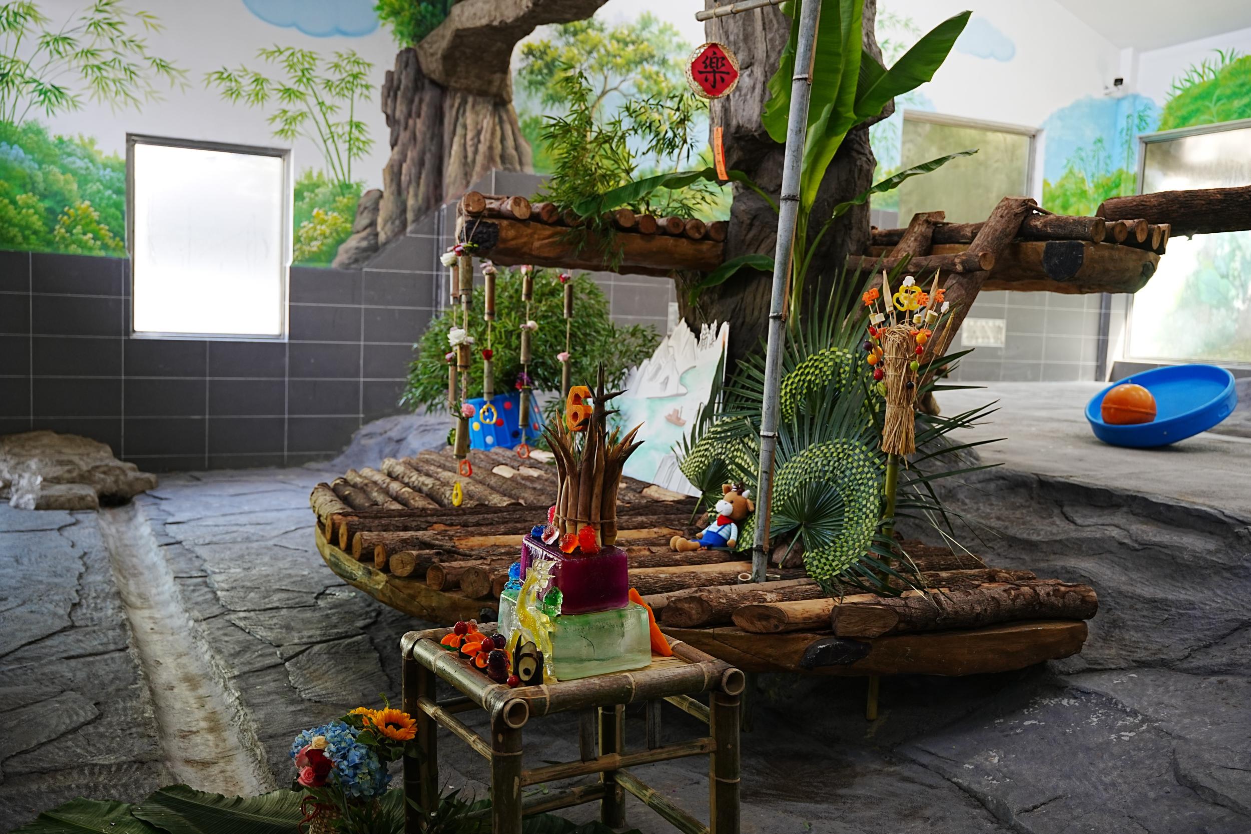 “寿星来了!”生日派对一开始,“宝弟”迈着稳健的步伐走进了运动场,嗅完竹叶和花瓣,走向了中央的“生日蛋糕”,开始享用这份特制的生日大餐。隔壁运动场的“宝妹”也没“闲着”,迈着轻快的步伐小跑入场后,也是被漂亮的生日派对现场和“生日大餐”所吸引,接着就开始慢慢享用。饱餐过后,它又轻巧地攀上栖架,在竹叶间惬意玩耍。