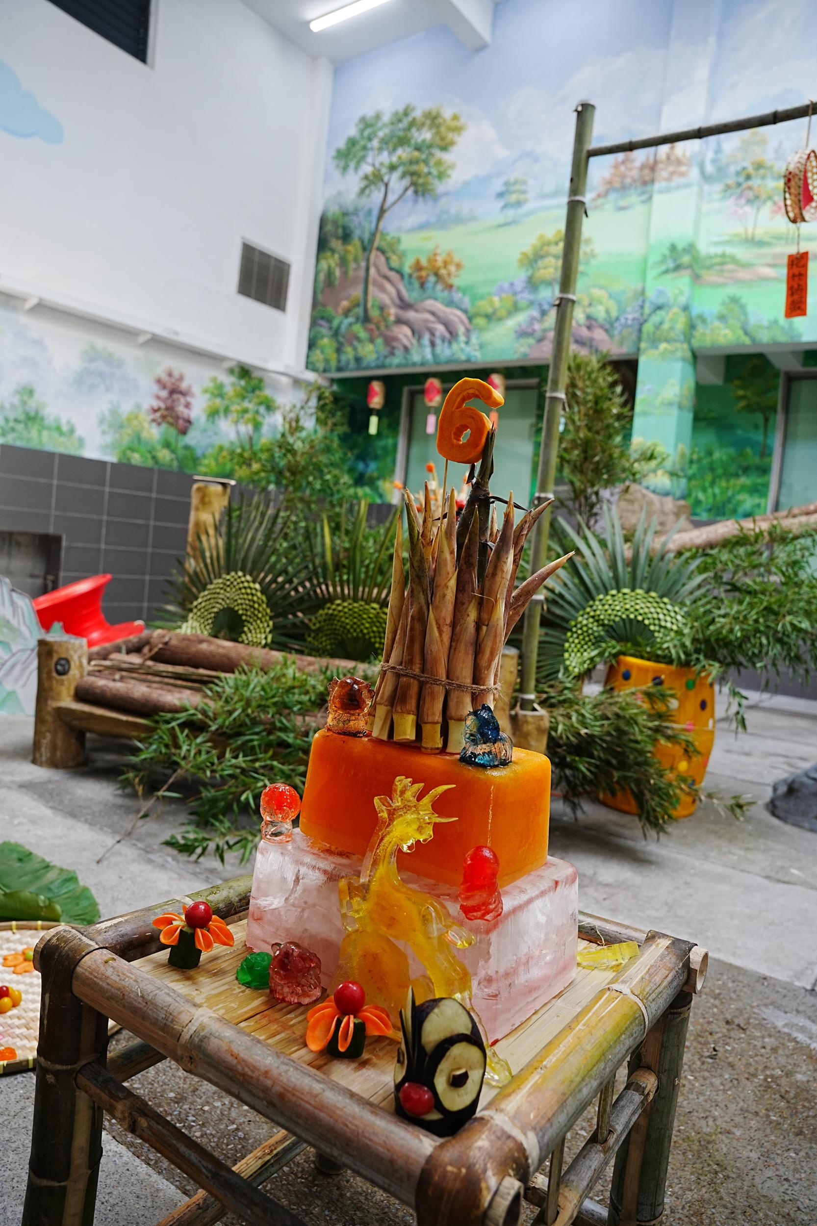 运动场的正中央,一个三层的豪华“生日蛋糕”格外引人注目。底层是用晶莹剔透的水果冰块雕琢而成的底座,装饰着代表温州元素的白鹿造型,顶层则由新鲜竹笋搭建而成,上面用南瓜块拼出醒目的“6”字造型,还点缀着南瓜、火龙果、圣女果等制成的彩色冰块。