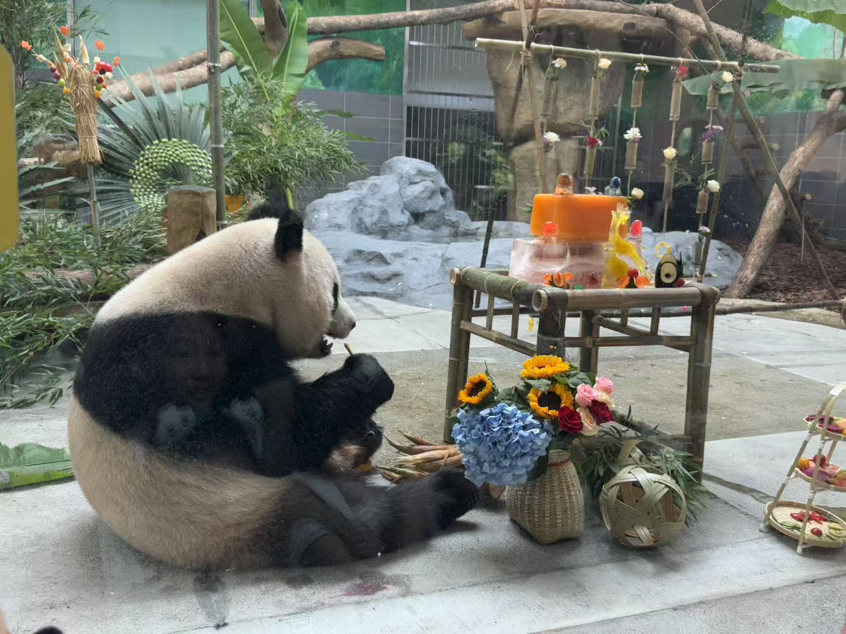 在“宝弟”“宝妹”的生日派对现场,一条由新鲜芭蕉叶铺就的“花路”从内舍延伸至熊猫馆运动场中央,沿途撒落着五彩斑斓的花瓣。