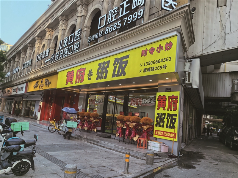 “‘黄府粥饭’是我母亲在1991年开的,因为地址在黄府巷,所以就取了这个名字。”周先生说,随着母亲年龄的增长,后又遇信河街拓宽拆迁,于是兄弟姐妹几人商议接手饭摊的经营。其中,除周先生的姐姐注册了“黄府粥饭”外,其余几人都是用各自的姓名注册营业执照,但仍统一使用“黄府粥饭”的招牌,“现在我们几个兄弟姐妹的年纪也大了,精力有限,最后只保留了锦绣路这一家门店。”