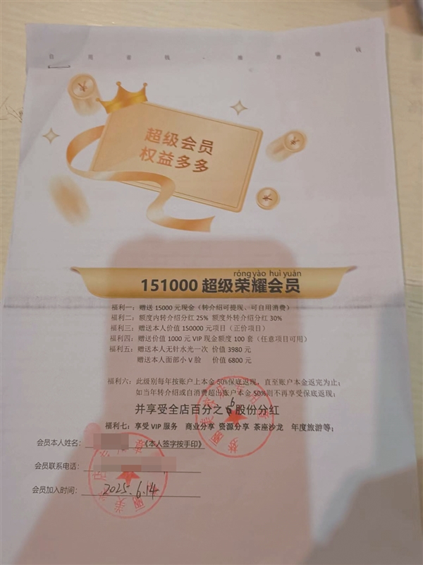 根据谢女士提供的材料,6月11日、13日,她向温州市鹿城区聚颖美容店(个体工商户)累计支付10.1万元,商品说明均为梦丽美容;6月14日,她向温州市鹿城区广化颖上理发店(个体户)累计支付3万元,商品说明为禾颖2楼美容部。 6月14日,她成为“151000超级荣誉会员”,并享受赠送15000元现金(转介绍可提现、可自用消费),每年按账户上本金50%保底返现、享受全店6%股份分红等福利。