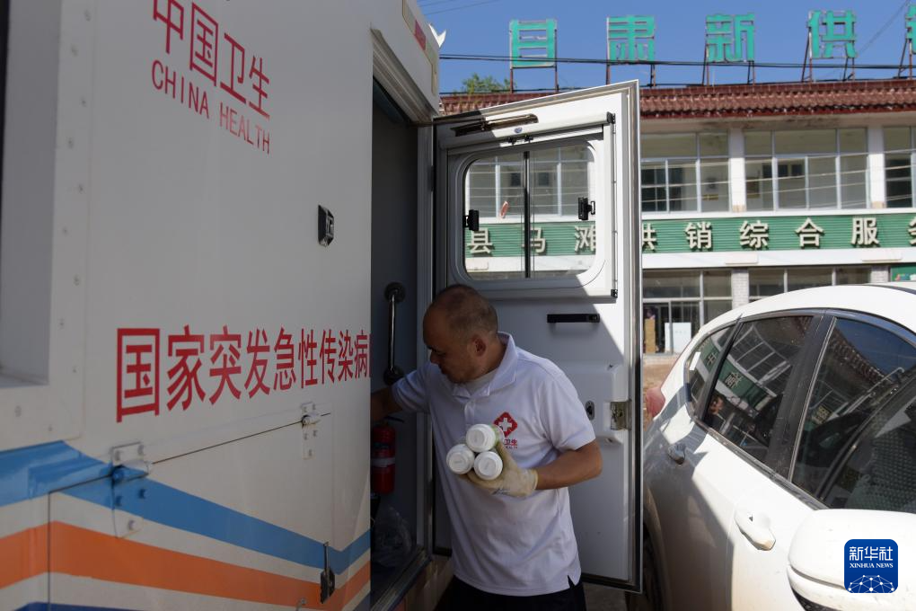 8月11日,在榆中县马坡乡马莲滩村,卫生防疫工作人员准备消杀药品。当日,甘肃省兰州市榆中县山洪灾害抢险救援工作持续展开,当地组织卫生防疫、供电、交通、水务等部门力量积极开展灾后恢复工作。新华社记者 范培珅 摄