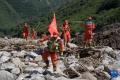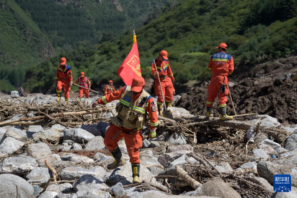 8月11日,在榆中县马坡乡阳屲山村,兰州市消防救援支队救援人员开展清理搜寻工作。当日,甘肃省兰州市榆中县山洪灾害抢险救援工作持续展开,当地组织卫生防疫、供电、交通、水务等部门力量积极开展灾后恢复工作。新华社记者 范培珅 摄
