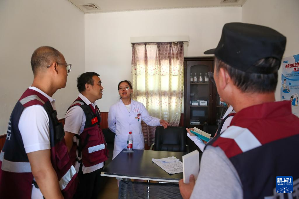 8月11日,在榆中县马坡乡上庄村临时安置点的医疗服务点,疾控人员和医护人员沟通环境消杀情况。当日,甘肃省兰州市榆中县山洪灾害抢险救援工作持续展开,当地组织卫生防疫、供电、交通、水务等部门力量积极开展灾后恢复工作。新华社记者 郎兵兵 摄