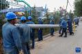 8月11日,在榆中县马坡乡上庄村,电力人员进行立杆架线作业。当日,甘肃省兰州市榆中县山洪灾害抢险救援工作持续展开,当地组织卫生防疫、供电、交通、水务等部门力量积极开展灾后恢复工作。新华社记者 郎兵兵 摄