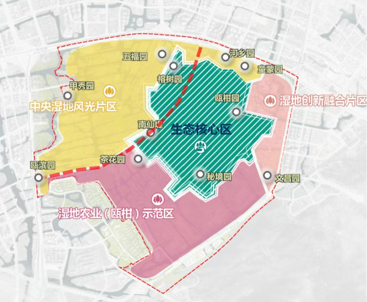 相较于上一轮规划,《详规》在功能定位、容量控制、生态管控分区、交通组织、空间形态等方面进行了全面优化,即以“生态优先、绿色发展”为底色,创新提出“一核三片十园”空间布局体系,推动湿地从单一生态保护向“生态-产业-生活”深度融合转型。“一核”即中部生态核心区,将重点强化生态保育功能,严格保护湿地原生生态系统,夯实生态本底;“三片”围绕核心区形成三大功能协同片区——西侧中央湿地风光片区以自然景观与生态体验为主,打造城市生态景观窗口;南侧湿地农业(瓯柑)示范片区聚焦生态农业与乡土文化融合,展现温州特色农耕文明;东侧湿地创新融合片区则作为产城融合的关键载体,布局生态文创、特色商业、旅游服务等活力业态。