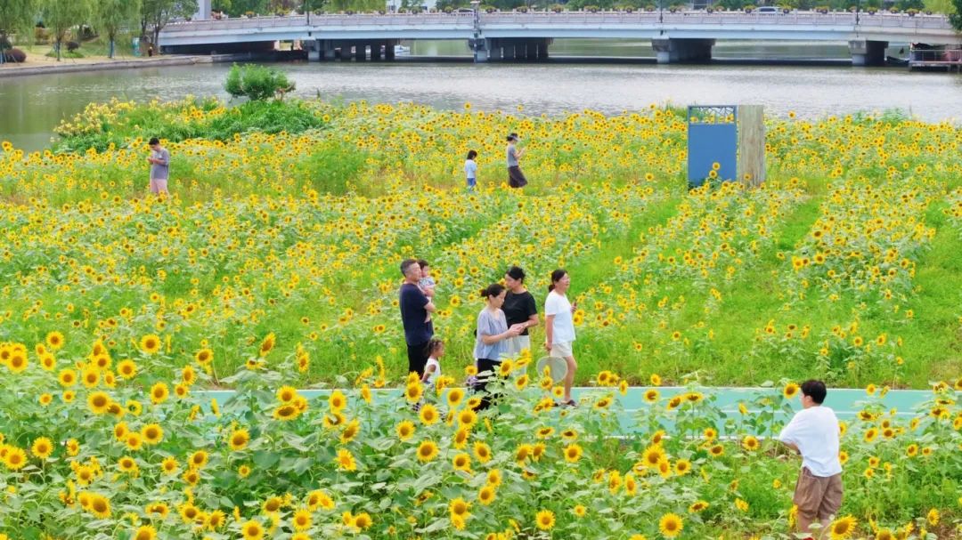 近日,在乐清市中运河西岸绿道,36亩向日葵花正以最热烈的姿态绽放,目光所及,金黄的花瓣肆意舒展,在阳光下流淌、闪烁,仿佛为绿道披上了一件“金装”,一大片的向日葵花田吸引了许多市民前往观赏打卡。市民可以沿着绿道散步、奔跑,或租一辆氢能共享单车骑行,这里也是天然的摄影棚,无论你是专业摄影师还是“手机党”,随手一拍就是氛围感大片。据了解,这片“金色花海”的盛花期还将持续一段时间,建议市民在上午9时以前或下午16时以后前往。向日葵盛开期在7月至8月,目前花期已经接近尾期,要打卡的市民要抓紧时间,趁早赏花。