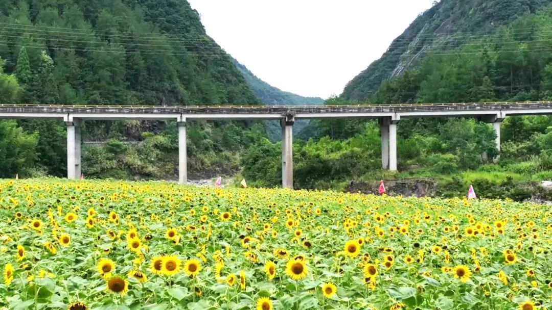 泰顺县廊桥文化园向日葵花海接近尾声,眼下,在廊桥文化园十亩向日葵花海竞相开放,大片金色花海与自然景致相映成趣,一跃成为“新晋网红”打卡点。据介绍,这里种植的向日葵是一种名叫“法兰西”的矮生品种,花朵较大、色彩鲜艳,且只开花不产籽,极具观赏价值。今年5月,廊氡管委会对廊桥文化园附近的闲置地块进行重新修整,播撒向日葵种子并精心呵护。如今,茁壮成长的向日葵花海与山风溪水相映成趣,并对游客免费开放。