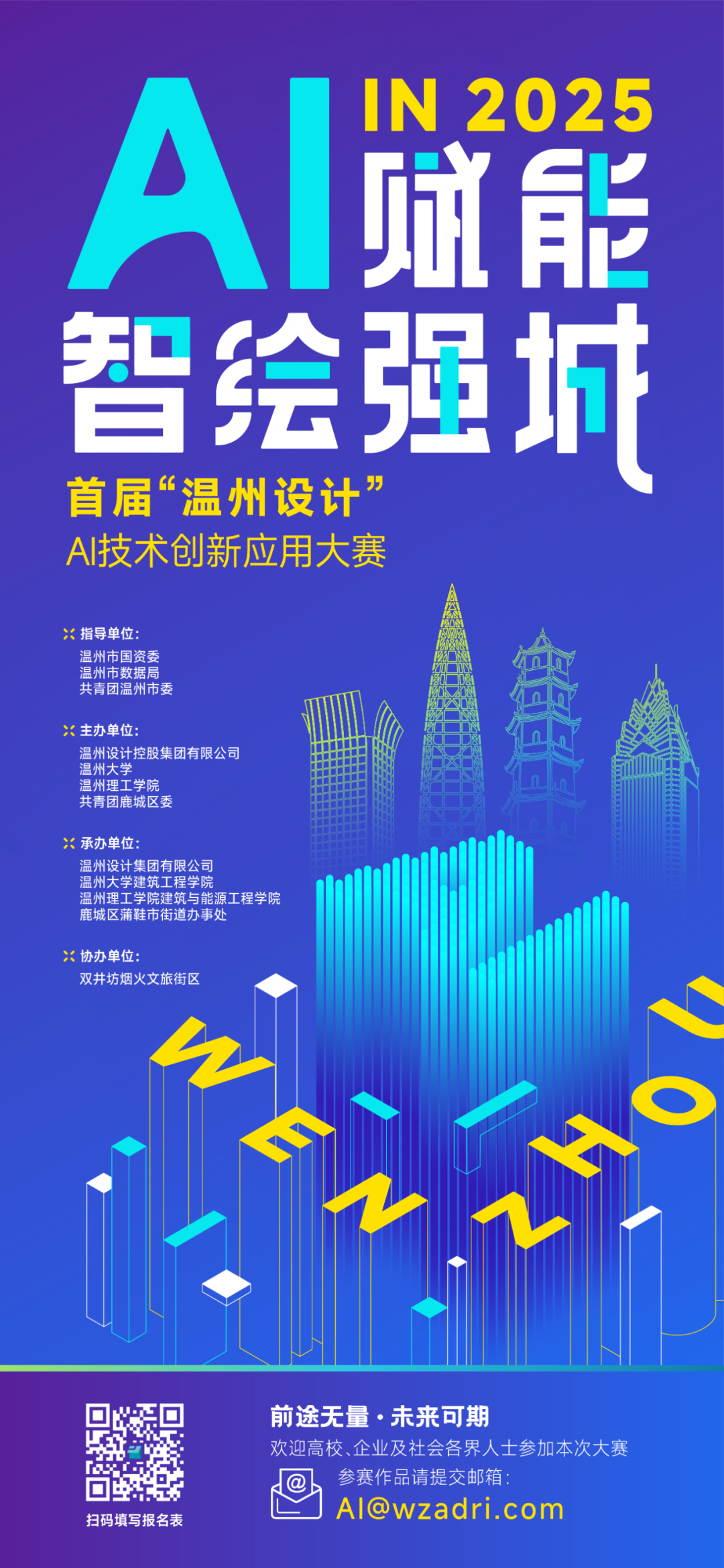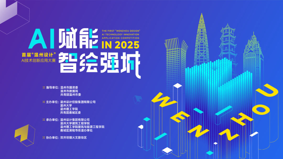 温州网讯 为全面贯彻党的二十届三中全会精神和市委十三届八次会议精神,积极推动技术创新和因地制宜发展新质生产力,探索AI技术在城市建设领域的深入应用,温州设计控股集团在温州市国资委、温州市数据局、共青团温州市委的指导和支持下,联合温州大学、温州理工学院及共青团鹿城区委共同举办以“AI赋能 智绘强城”为主题的AI技术创新应用大赛,旨在以赛引才、以赛促研、以赛促产,鼓励参赛者应用前沿AI技术,聚焦城市更新、园博园等城市建设热点构建创意设计,也鼓励参赛者通过AI技术探索其在各领域的应用潜力,解决工作及生活中的实际问题,共同开拓AI技术应用新场景,推动AI技术与产学研等相关领域的深度融合。