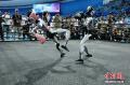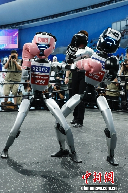 8月15日,世界人形机器人运动会在北京国家速滑馆(冰丝带)开赛。图为机器人进行自由搏击比赛。中新社记者 韩海丹 摄