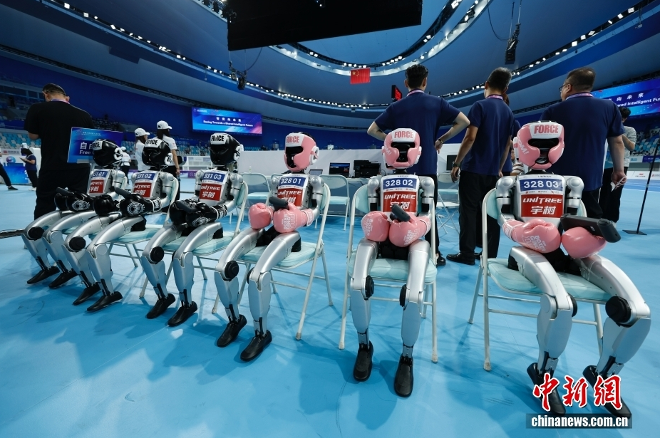 8月15日,世界人形机器人运动会在北京国家速滑馆(冰丝带)开赛。图为自由搏击比赛机器人候场。中新社记者 韩海丹 摄