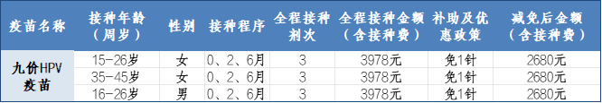 16-26周岁男性、15-26周岁女性及35-45周岁女性共接种3剂次,按0、2、6月程序推荐接种。享受第3剂次疫苗免费政策,即受种者接种第1、2剂次九价HPV疫苗时,接种单位收取相应剂次疫苗费(1298元/剂次)和预防接种服务费(28元/剂次);接种第3剂次九价HPV疫苗时,接种单位仅收取本次预防接种服务费(28元/剂次)。