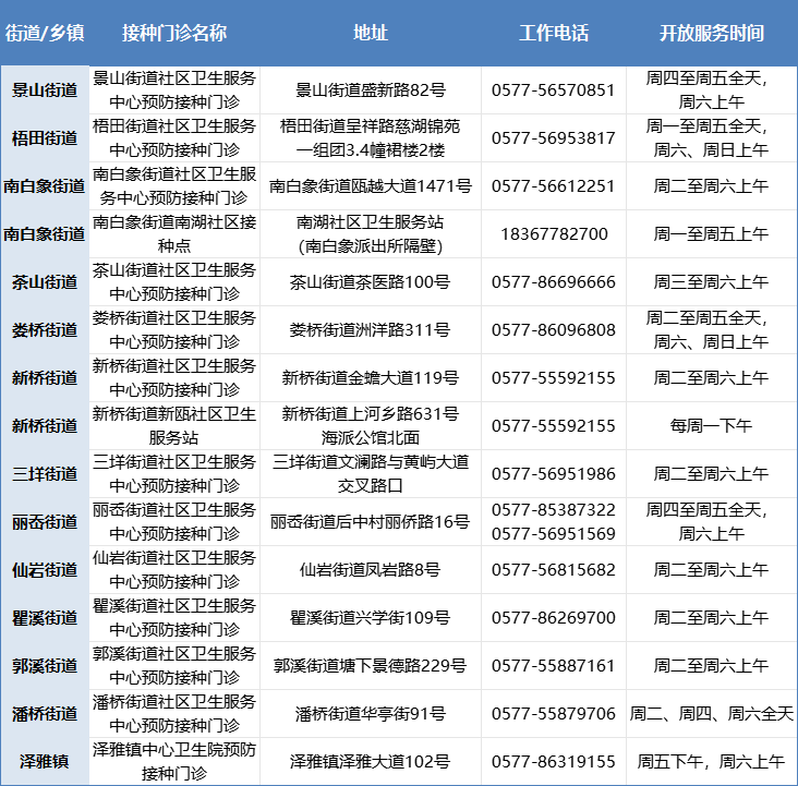 2025年瓯海区社区卫生服务中心(乡镇卫生院)预防接种门诊信息